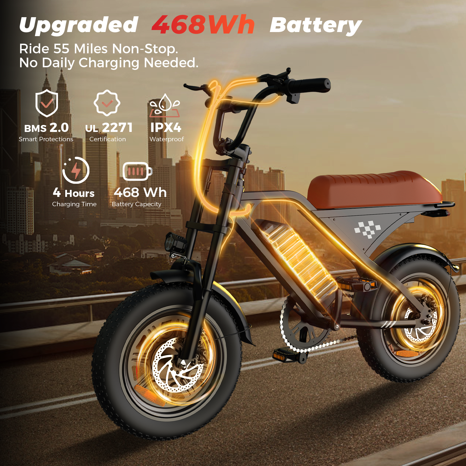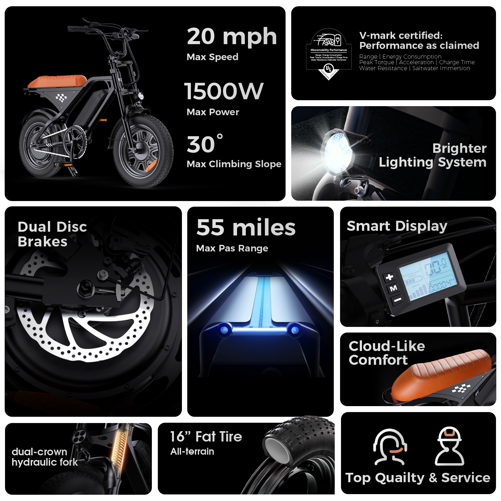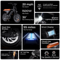 Off Road Electric Bike for Adults 16" Fat Tire 1500W 55+ Miles Full Suspension Bright Headlight Long Seat 20mph Commuting Electric Dirt Bike Mountains EBike UL2849 Electric Motorcycle All-Terrain